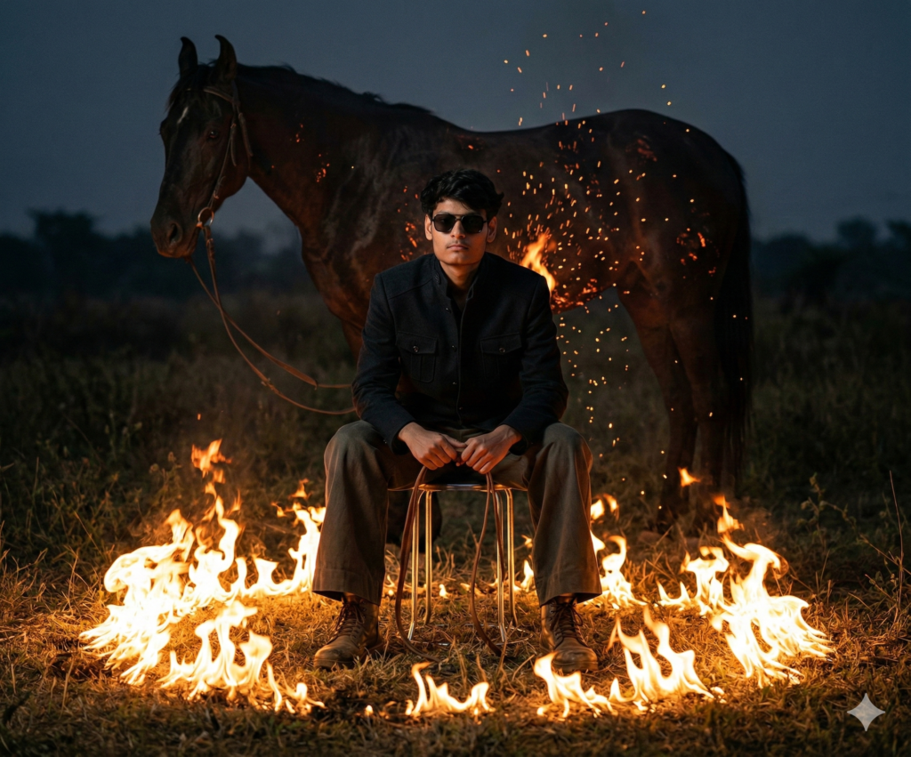 Contrasty artistic editorial photography of a young man based on the reference image, preserving identity. He is seated low on a minimalist metal stool in an open natural Landscape overgrown with wild grass. His legs are stretched forward, feet firmly planted on the ground. He is wearing dark, layered clothing: a structured jacket, wide trousers, rugged leather boots, and dark sunglasses. His hair is loose and styled naturally. One hand rests freely between his knees, holding thin leather reins, conveying a sense of calm control. His posture is slightly slouched, shoulders relaxed, head tilted slightly downward, with a calm, thoughtful, and confident expression A ring of fire blazes on the ground surrounding him. Directly behind him stands a powerful horse, its body partially overlapping his silhouette in the frame. The horse emits subtle sparks of fire and smoldering ember effects, enhancing the intensity without compromising realism. The scene takes place at night, with a dark, Do not edit or change my face.