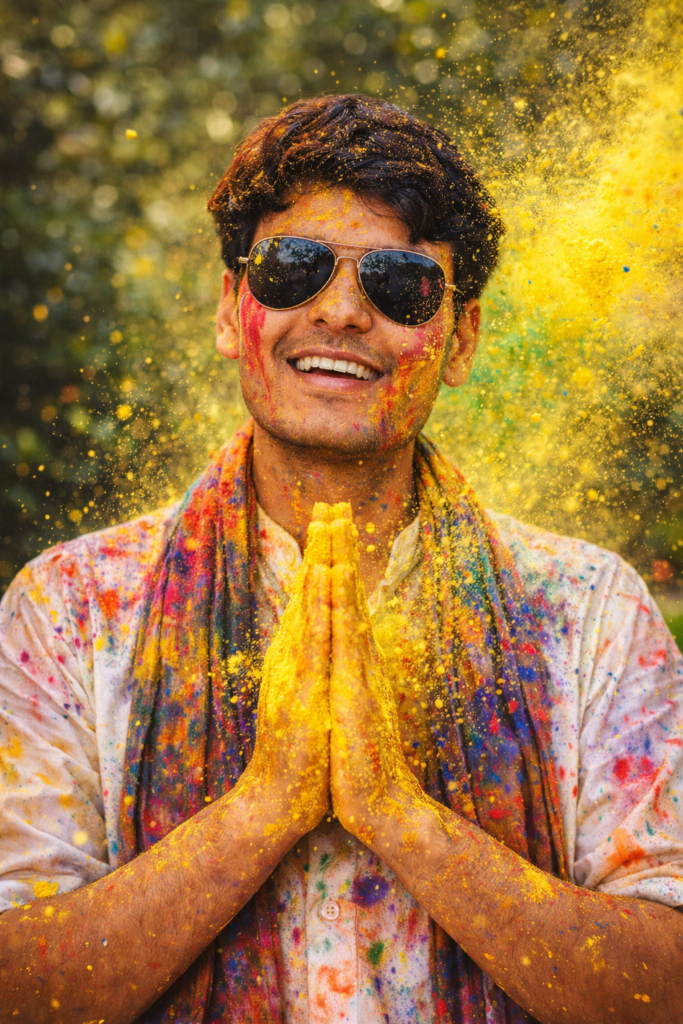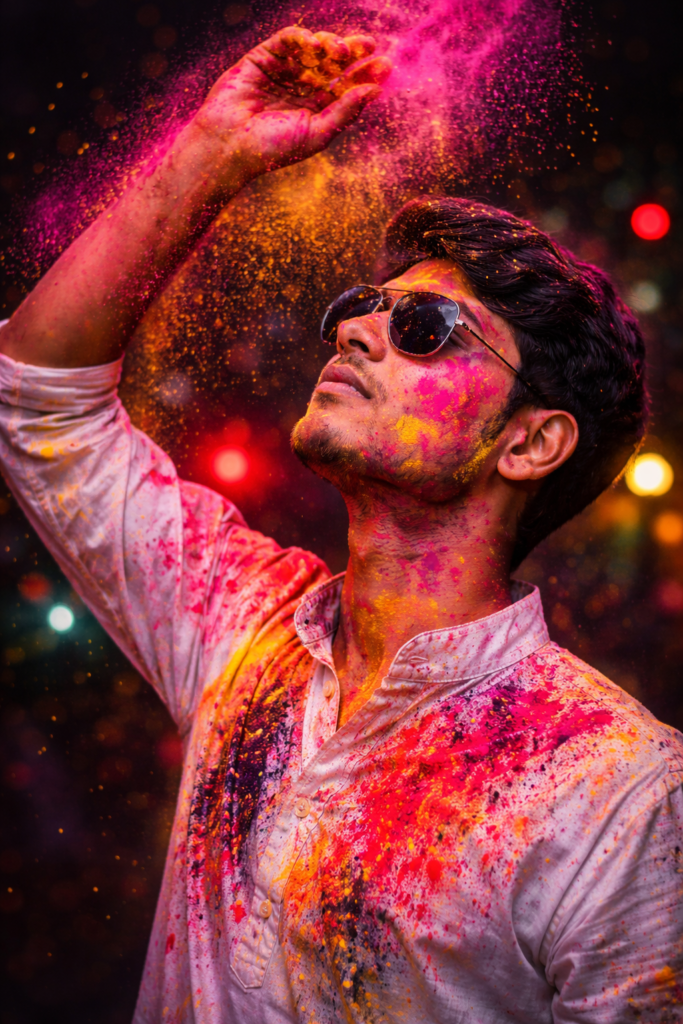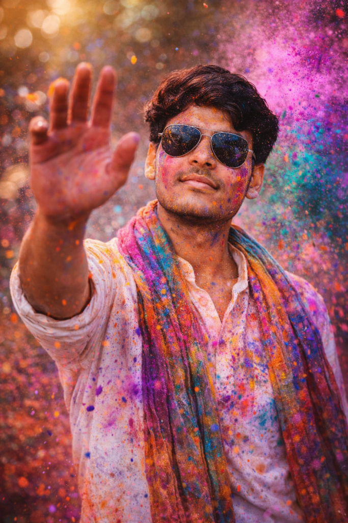 Ultra-realistic cinematic Holi portrait of a young Boy same face (early 20s) wearing a white kurta and a long scarf/ dupatta, sunglasses covered in colorful gulal powder. He raises one hand forward as bright color dust explodes in the air around him. Soft with eyes slightly closed, light beard. Outdoor background with dreamy bokeh, Holi festival Vibe vibrant colors, shallow depth of field, dynamic particles, high contrast, 8K photorealistic, festival vibe. Same face 9:16, Do not edit or change my face.