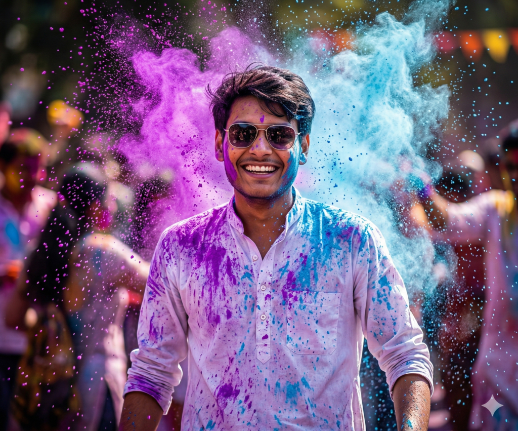 High-speed photography masterpiece. A young Boy naturally smile joyfully as a cloud of vibrant neon purple and sky-blue Holi powder explodes around him. He is wearing a crisp white kurta with sunglasses that is becoming a chaotic canvas of colors. Water droplets suspended mid-air, candid expression, eyes sparkling with pure happiness. The festive energy radiates through his natural smile and relaxed posture. The background is a soft bokeh blur of a lively Holi crowd. Cinematic backlighting creates a glowing rim light around his silhouette, highlighting hyper-detailed skin texture and wet fabric details. 8K resolution, photorealistic, ultra-sharp focus, dynamic motion freeze, vibrant color contrast. (Use attached reference image for face), Do not edit or change my face.