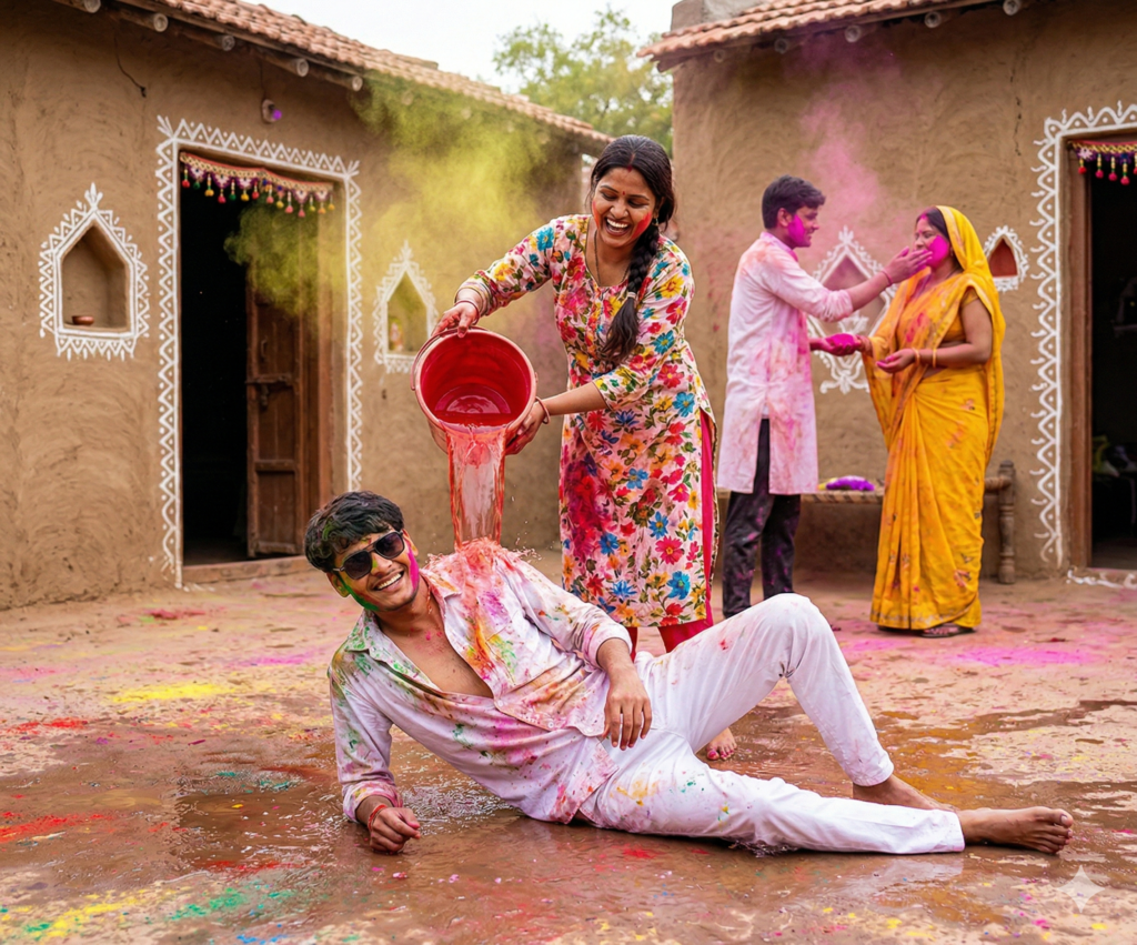 A vibrant rural Indian Holi celebration in a village courtyard under bright daylight. In the foreground, a young Boy with the likeness of the person in the uploaded image, wearing white pants and an open white shirt heavily stained with colorful Holi powders, and same sunglasses, lies playfully on the wet ground with a cheerful expression. A laughing woman in a colorful floral kurta pours red-tinted water over him from a bucket. In the background, a man applies pink powder to a woman dressed in a yellow sari with traditional bangles. The air is filled with colorful powder clouds (gulal). The setting includes traditional mud-plastered houses decorated with white folk art (Mandana or Warli). High-fidelity, cinematic style, 4k, Do not edit or change my face.